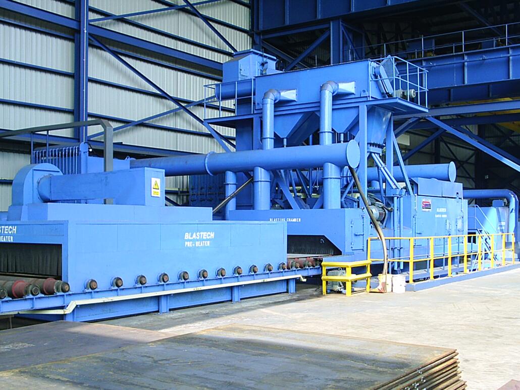 鋼板預處理線的簡介:鋼材預處理線工藝是指鋼材在加工前(即原材料狀態)進行表面拋丸除銹并涂上一層保護底漆的加工工藝。鋼材經過預處理可以提高機械產品和金屬構件的抗腐蝕能力,提高鋼板的抗疲勞性能,延長其使用壽命;同時還可以優化鋼材表面工藝制作狀態,有利于數控切割機下料和精密落料。此外,由于加工前鋼材形狀比較規則,有利于機械除銹和自動化噴漆,因此采用鋼材預處理可大大提高清理工作的效率,減輕清理工作的勞動強度和對環境的污染。