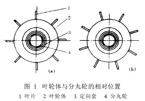 如圖1a所示,分丸輪窗口在兩個葉片中間,此時的拋丸機的清理效果好:而圖1b所示的分丸輪窗口正對著葉片,此時分丸輪分出的彈丸受到葉片的阻擋,拋出去的彈丸少,從而影響拋丸量。
