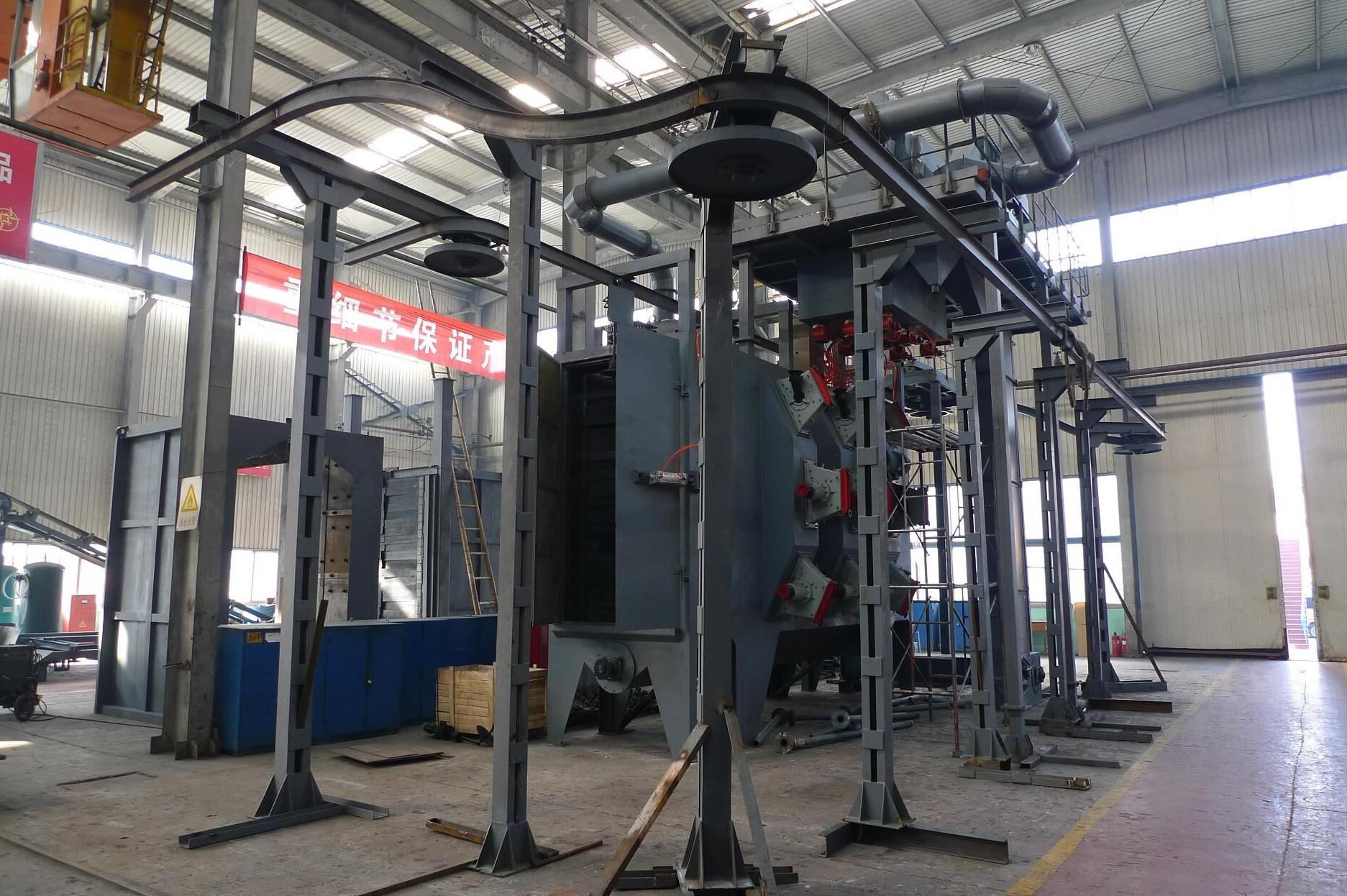 工件在吊具的吊裝下進入拋丸清理室,當進入拋丸清理區后,懸鏈自動停止,同時大門關閉,工件在自轉機構的驅動下自轉,同時拋丸器對工件進行拋丸清理,清理完畢,彈丸控制器停止供丸,大門打開,工件在懸鏈輸送系統的驅動下被輸送出拋丸清理室,同時下一組鉤吊裝的工件被輸送進拋丸清理室,重復以上過程,對工件進行高效率的拋丸清理。